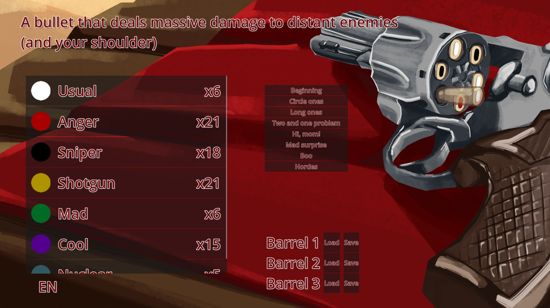 Also, you can save bullet sets in 3 different slots (barrels) and then quickly load them by pressing the corresponding buttons at the bottom of the screen.