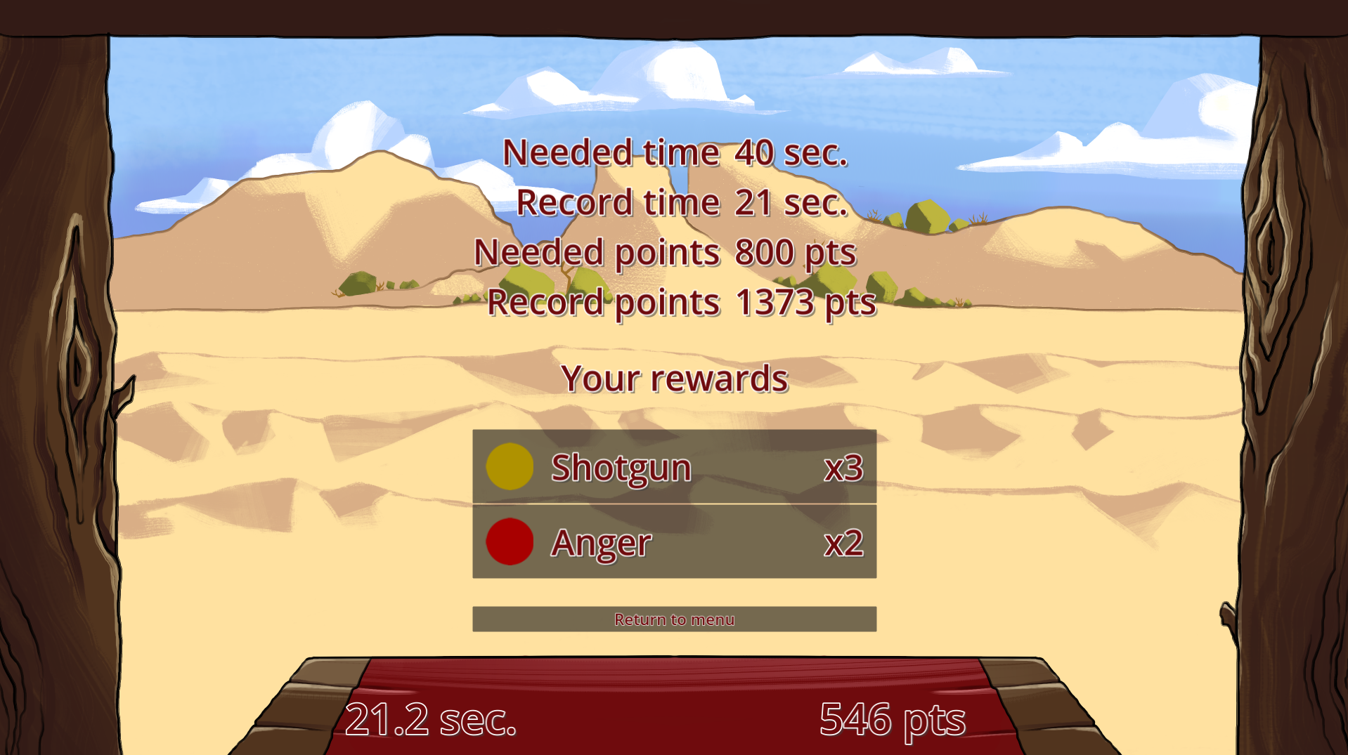 Each level has a separate reward (bullets) for the fastest completion and the most point worthy. Upon returning to the main menu after completing the first level, you can change a set of bullets. You can remove standard bullets and add new ones by selecting them at the left panel.